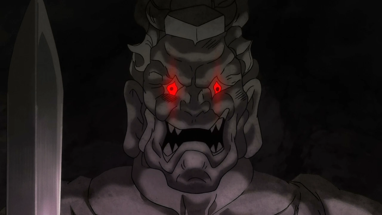 Hakumenfudo (白面不動, Hakumen Fudō) was one of the demons that made a contract with Kagemitsu Daigo. In the 2019 anime, this is not the case as it does not return any body parts to Hyakkimaru and there is no footage of any statue from the Hall of Hell's being broken after its defeat. Nevertheless, its role in the story largely remains the same.